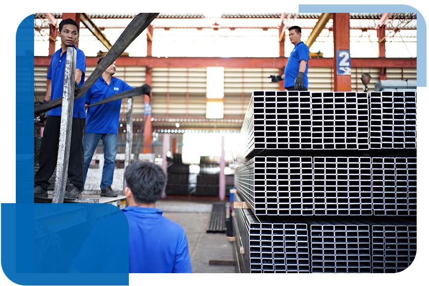 ทางบริษัทเล็งเห็นถึงความสำคัญในการรองรับเหล็กกว่า 2,000 ชนิด จึงได้จัดเตรียมคลังสินค้าขนาดใหญ่ ซึ่งมีสต๊อกสินค้ารวมกว่า 20,000 ตัน เพื่อบริการแก่ลูกค้าได้ทันทีทันใด ซึ่งทำให้บริษัทของเรามีหน้าที่เป็นศูนย์กลางสินค้าประเภทเหล็กที่สามารถให้บริการแก่ลูกค้าได้ทันที โดยไม่ต้องรอโรงงานผลิต นอกเหนือจากคลังสินค้าขนาดใหญ่ เรายังคำนึงถึงทำเลที่ตั้งเป็นปัจจัยสำคัญ ต้องมีความสะดวกในการเดินทาง การจราจรที่คล่องตัว และสามารถเดินทางออกสู่จังหวัดต่างๆได้ เราจึงเลือกที่ดินขนาด 24 ไร่ บนถนนกิ่งแก้ว ซึ่งเป็นทำเลที่ใกล้สนามบินสุวรรณภูมิ มีถนนสายต่างๆ ไม่ว่าจะเป็นถนนบางนา-ตราด และถนนมอเตอร์เวย์ที่จะออกสู่ภาคตะวันออก ถนนวงแหวนรอบนอกตะวันออก ซึ่งสามารถวิ่งออกสู่ภาคเหนือ และภาคตะวันออกเฉียงเหนือ หรือภาคใต้ได้อย่างง่ายดาย ทางบริษัทยังมีรถขนส่งไว้บริการลูกค้าทั่วประเทศ ไม่ว่าจะเป็นรถสี่ล้อ หกล้อ สิบล้อ รถติดเครน และรถเทรลเลอร์ รวมกว่า 30 คัน และพนักงานกว่าร้อยคน ซึ่งสามารถให้บริการแก่ลูกค้าด้วยความรวดเร็ว ยุติธรรมและเป็นกันเอง