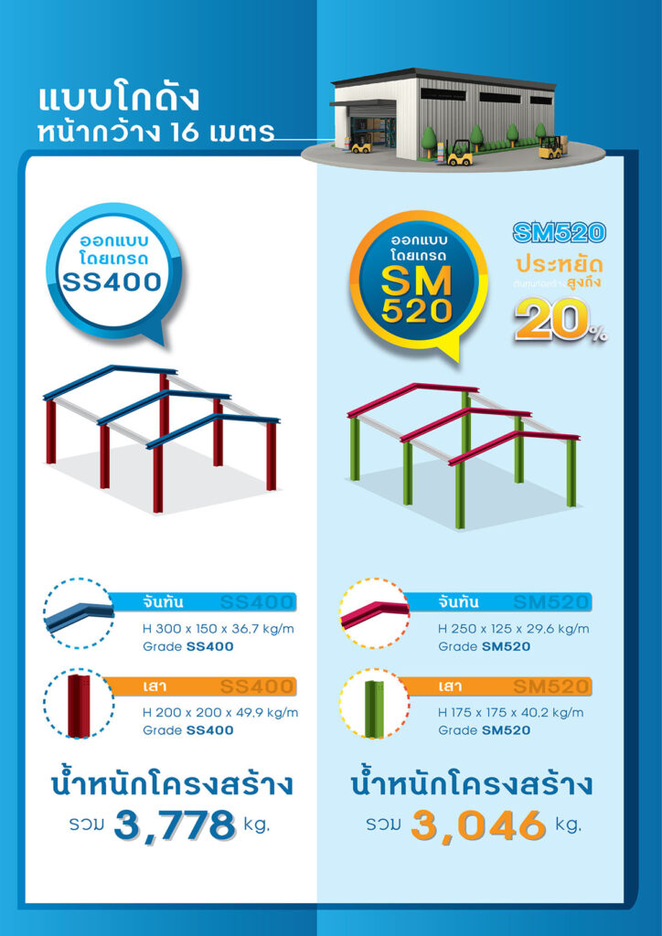 ตัวอย่างการก่อสร้างโกดังสินค้า ขนาดหน้ากว้าง 16 เมตร หากออกแบบด้วยโครงสร้างเหล็กเกรด SM520 สามารถประหยัดได้กว่า 20% หากเปรียบเทีบกับการออกแบบด้วยโครงสร้างเหล็กเกรด SS400